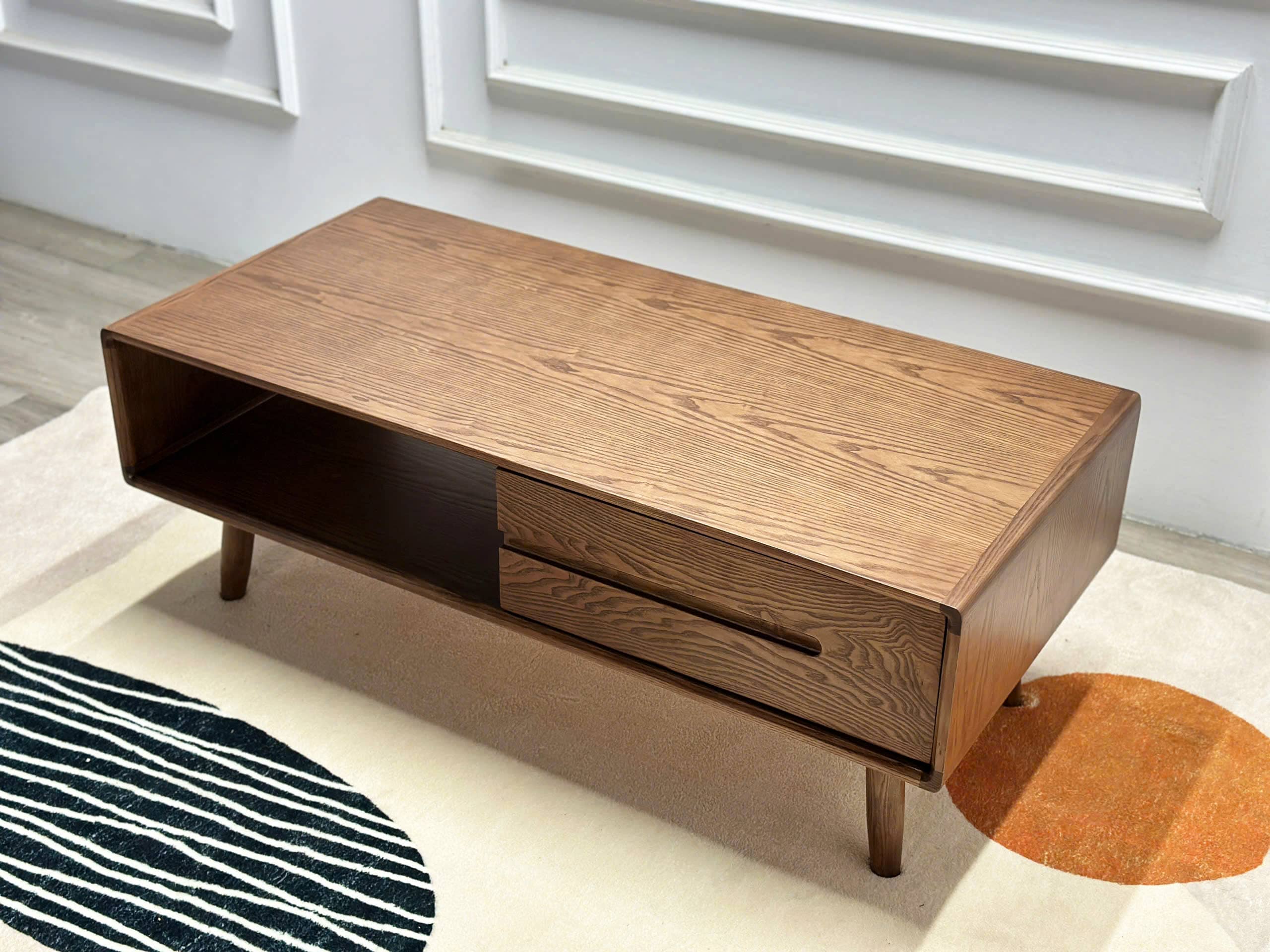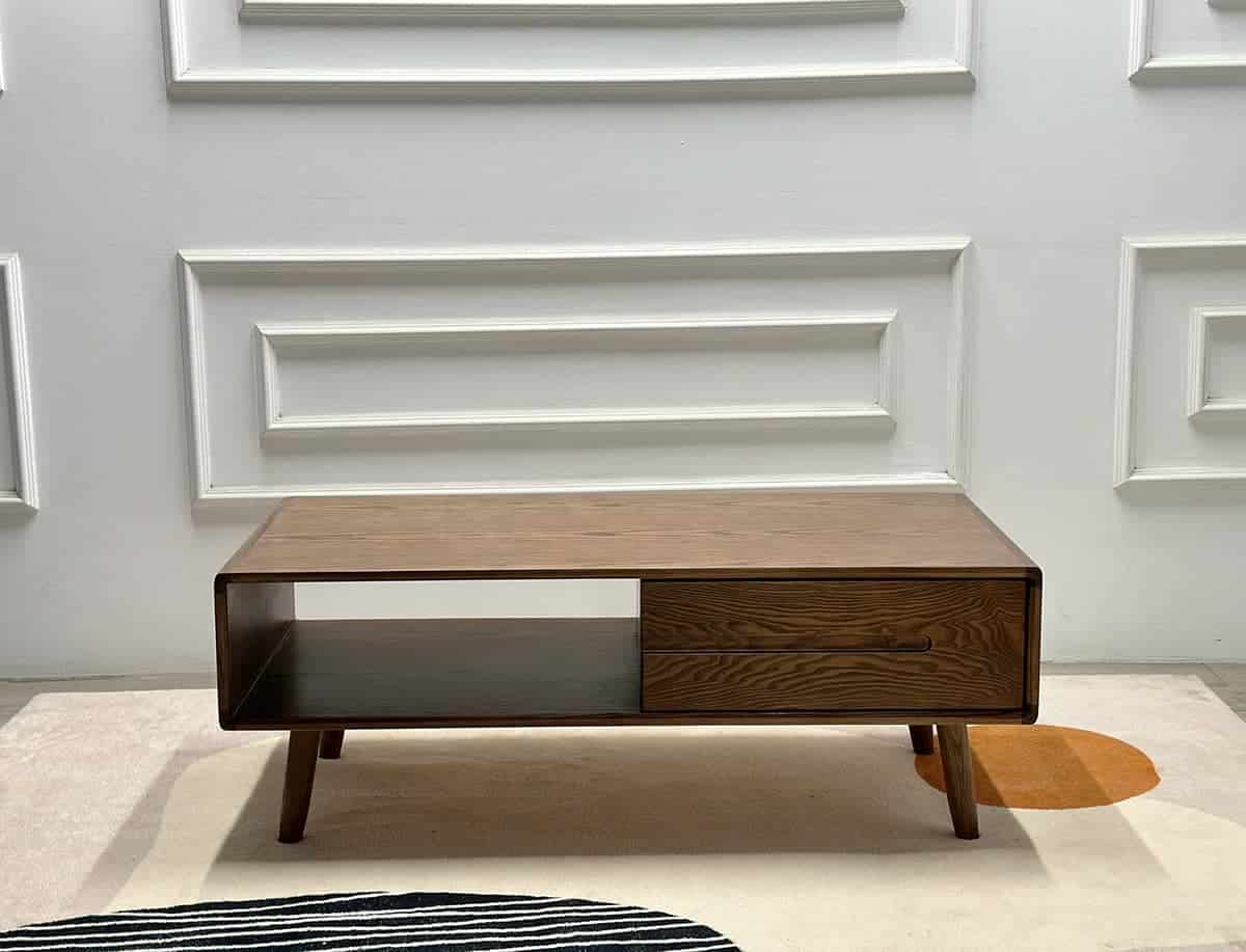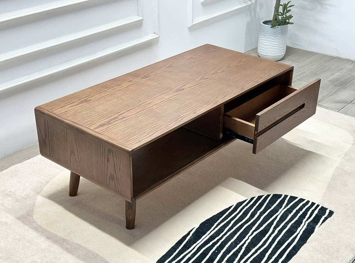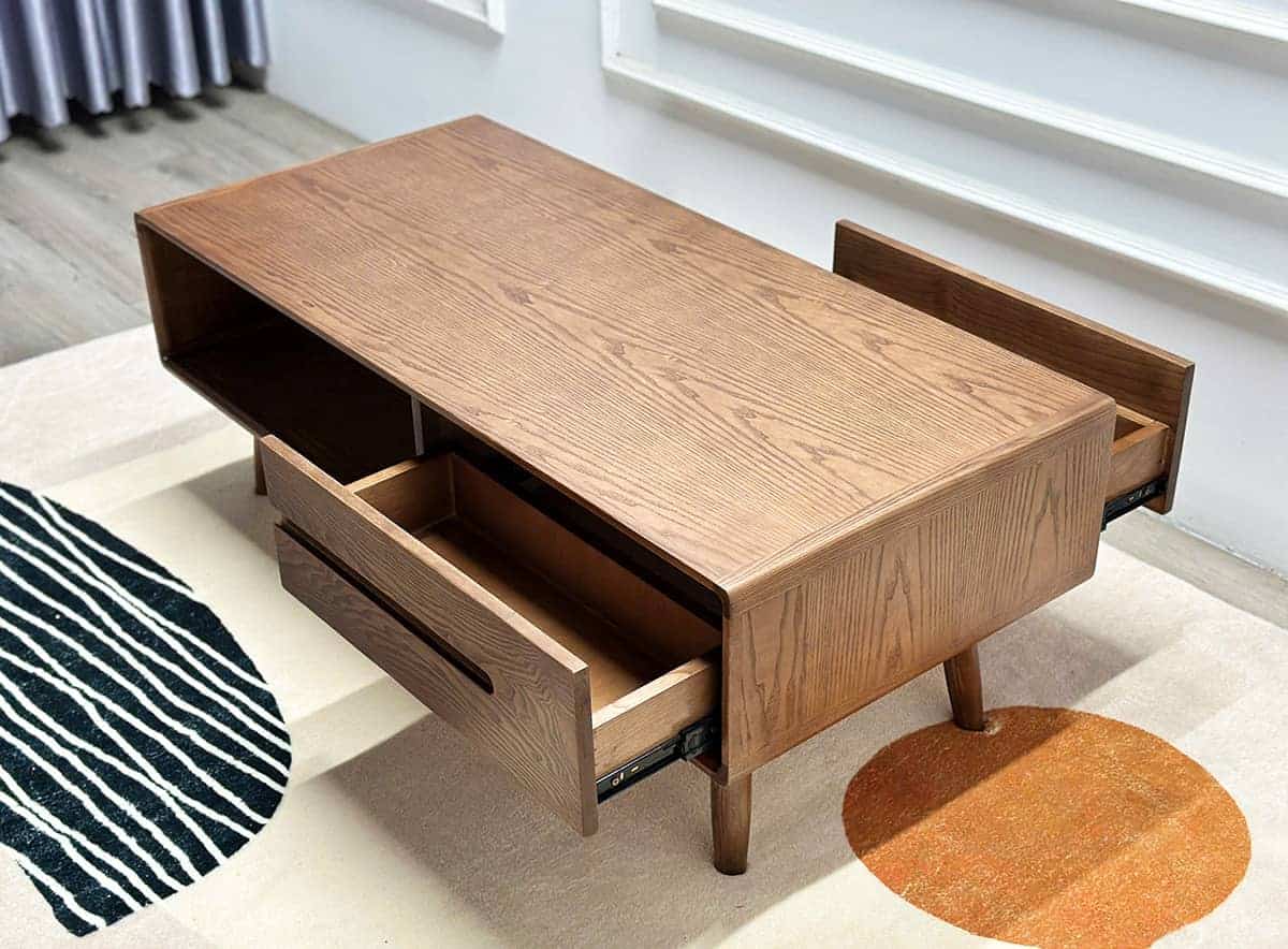 Mặt bàn phẳng, rộng, kết hợp cùng ngăn kéo đôi và khoang hở tiện lợi giúp tối ưu không gian lưu trữ. Bạn có thể dễ dàng cất giữ điều khiển, tạp chí hay các vật dụng nhỏ, giữ cho phòng khách luôn gọn gàng, thoáng đãng.