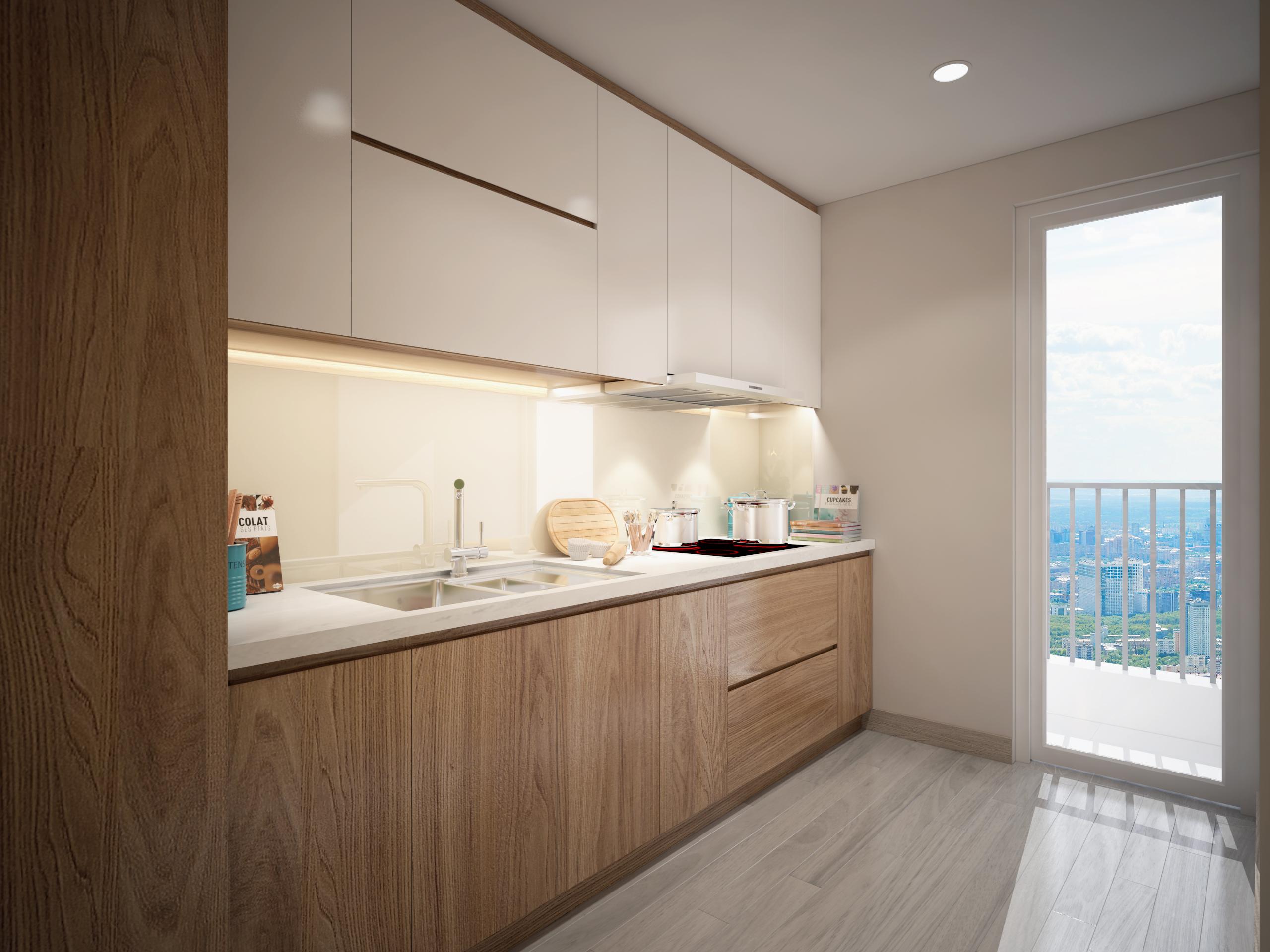 Căn hộ được thiết kế với chất liệu MFC An Cường, là dòng gỗ công nghiệp có chất lượng khá tốt và được thị trường nội thất ưa chuộng. Đặc biệt rất phù hợp với thiết kế nội thất chung cư hiện đại.
