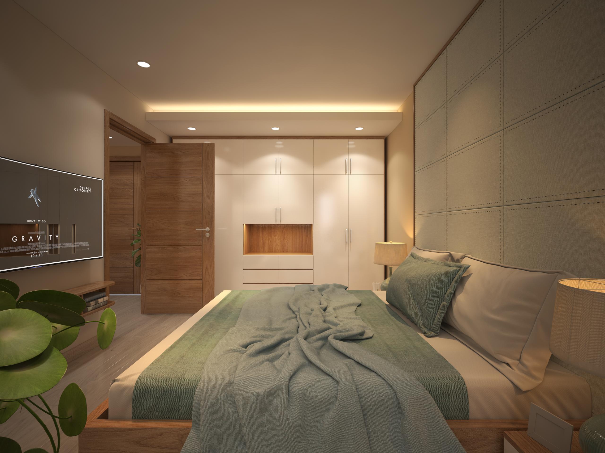 Giường ngủ, bàn làm việc, kệ tivi được thiết kế gọn gàng với lối đi quanh giường giúp tận dụng tối đa không gian trong phòng mà vẫn đáp ứng đủ công năng sử dụng.