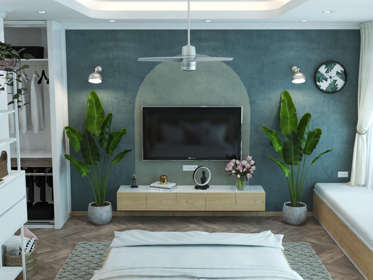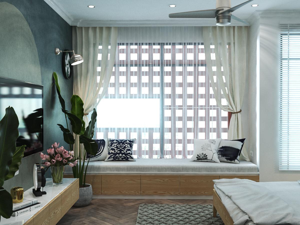Đối diện giường ngủ là một kệ tivi treo tường gọn gàng, bên cửa sổ phòng dành cho bố mẹ là một sofa thư giãn, nó được thiết kế với nhiều chức năng, có thể sử dụng như một sofa thư giãn hay một giường ngủ đơn, đôi khi là một góc làm việc khi chỉ cần sử dụng một chiếc bàn nhỏ. Phần bên dưới là các học tủ để có thể chứa thêm những đồ dùng.