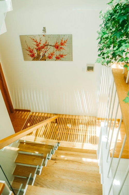 Tuy nhiên sau khi cải tạo và thay đổi thiết kế, các kiến trúc sư nhận được sự đồng ý của gia chủ đã phá bỏ hoàn toàn hai hệ cầu thang cũ. Thay vào đó thiết kế bậc cầu thang gỗ kết hợp tay vịn gỗ và lan cán kính cường lực trong suốt. Điều này giúp không gian sống trở nên thanh thoát hơn, ánh sáng được lan tỏa ra khắp không gian trong nhà.