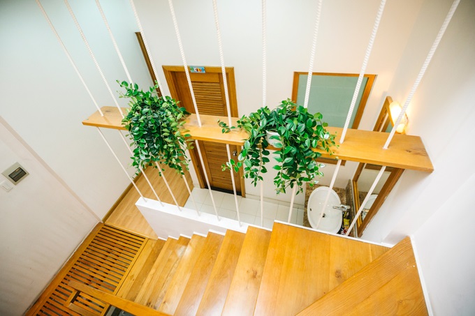 Ngoài khắc phục diện tích bạn có biết thiết kế này giúp gia chủ tiết kiệm được một khoản lớn ngân sách cho tiền điện trong việc chiếu sáng toàn bộ không gian trong nhà hay không? Hơn nữa, màu vàng sáng của gỗ, sơn tường trắng tinh khôi khi kết hợp với những bình cây nhỏ xanh ngắt càng khiến lối lên xuống trở nên thú vị hơn.