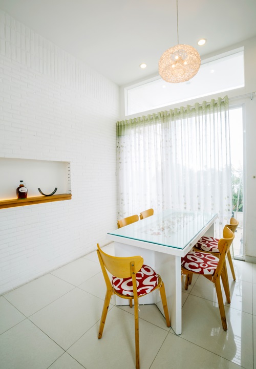 Phòng bếp, phòng ăn thể hiện khá rõ cá tính của gia chủ. Đây có lẽ là không gian thú vị nhất trong nhà, nó cho phép gia chủ mở tầm nhìn rộng ra khoảng sân trồng cây xanh phía trước, giúp người sống trong nhà gần gũi thiên nhiên, lấy lại sự cân bằng trong cuộc sống sau ngày dài làm việc mệt mỏi và lao đao với những bồn bề trong cuộc sống.
