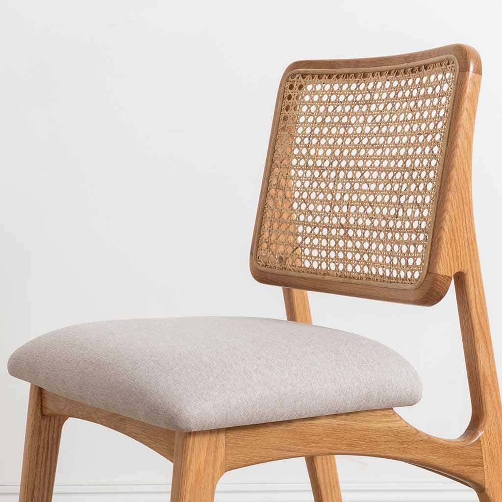 Ghế Latus sở hữu khung gỗ tự nhiên chắc chắn, kết hợp với lưng ghế bằng mây đan thủ công, tạo nên sự hài hòa giữa yếu tố truyền thống và nét đẹp đương đại. Phần chân ghế có kết cấu vững chãi, được gia công tỉ mỉ để giữ được sự thanh thoát nhưng vẫn đảm bảo độ bền theo thời gian.