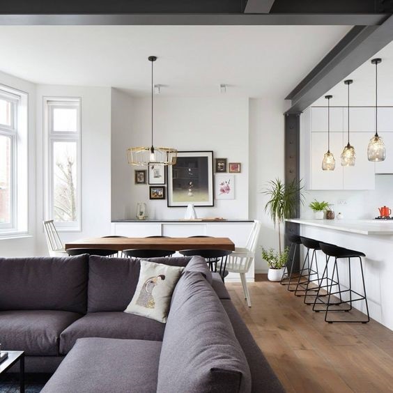 Với khu vực sinh hoạt chung như phòng khách, bạn có thể treo một chùm đèn hợp với phong cách thiết kế như hiện đại hay cổ điển. Tại khu vực ăn uống, chỉ cần những ngọn đèn nhỏ, đủ chiếu sáng tập trung vào bàn ăn bởi khu vực này vẫn tận dụng được ánh sáng từ các không gian lân cận. Còn khu bếp sẽ sử dụng những bóng chiếu sáng đơn giản cho ánh sáng tập trung bên dưới trần hay dưới tủ bếp và trên bếp nấu.