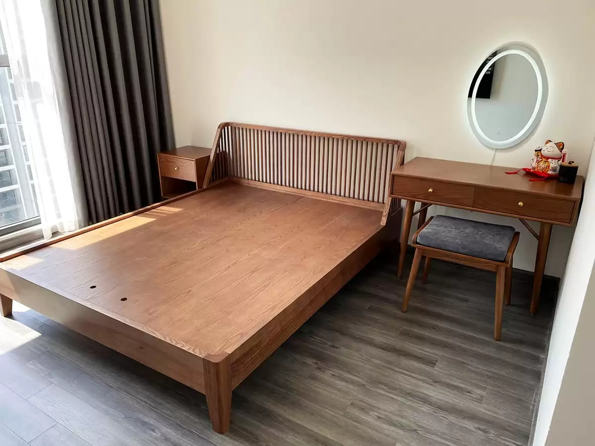 Mẫu giường này được chế tác từ gỗ tự nhiên cao cấp, bề mặt xử lý kỹ lưỡng để giữ vân gỗ mộc mạc nhưng vẫn đảm bảo độ bền chắc và sang trọng.