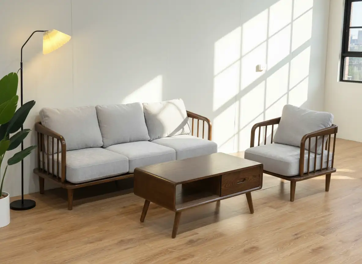 ✔ Tay vịn dạng nan gỗ – đặc trưng của sofa Japandi
