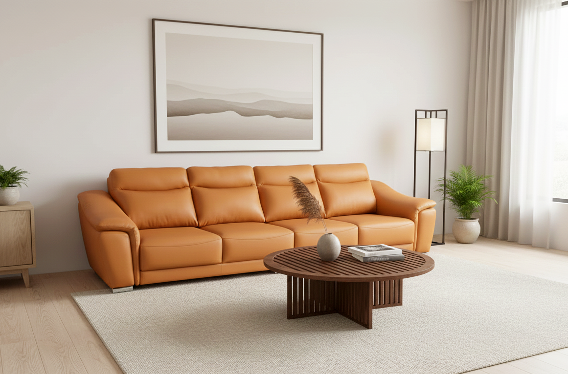 Để làm nổi bật mẫu sofa màu cam đất này, bạn nên kết hợp với một chiếc bàn trà mặt đá đen hoặc gỗ màu óc chó trầm. Thêm một vài chiếc gối tựa màu kem hoặc xám nhạt để tạo nên sự cân bằng hoàn hảo cho thị giác.