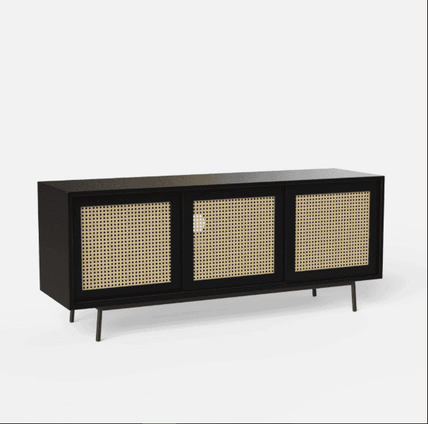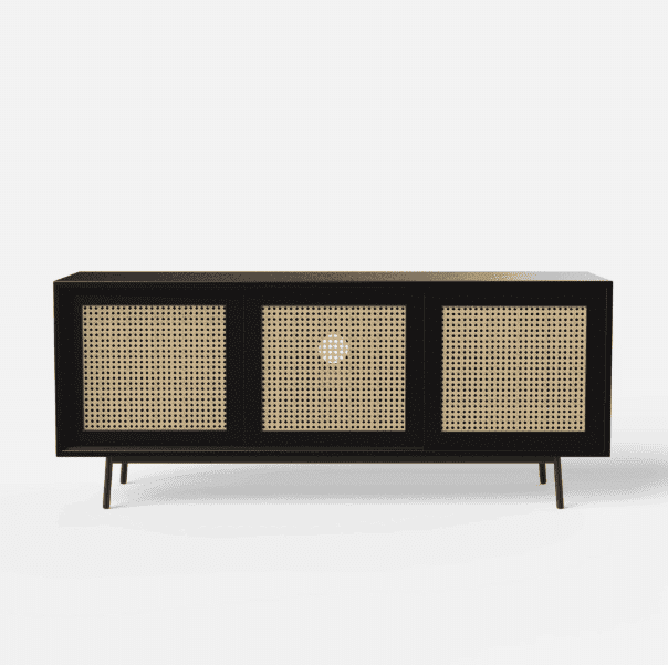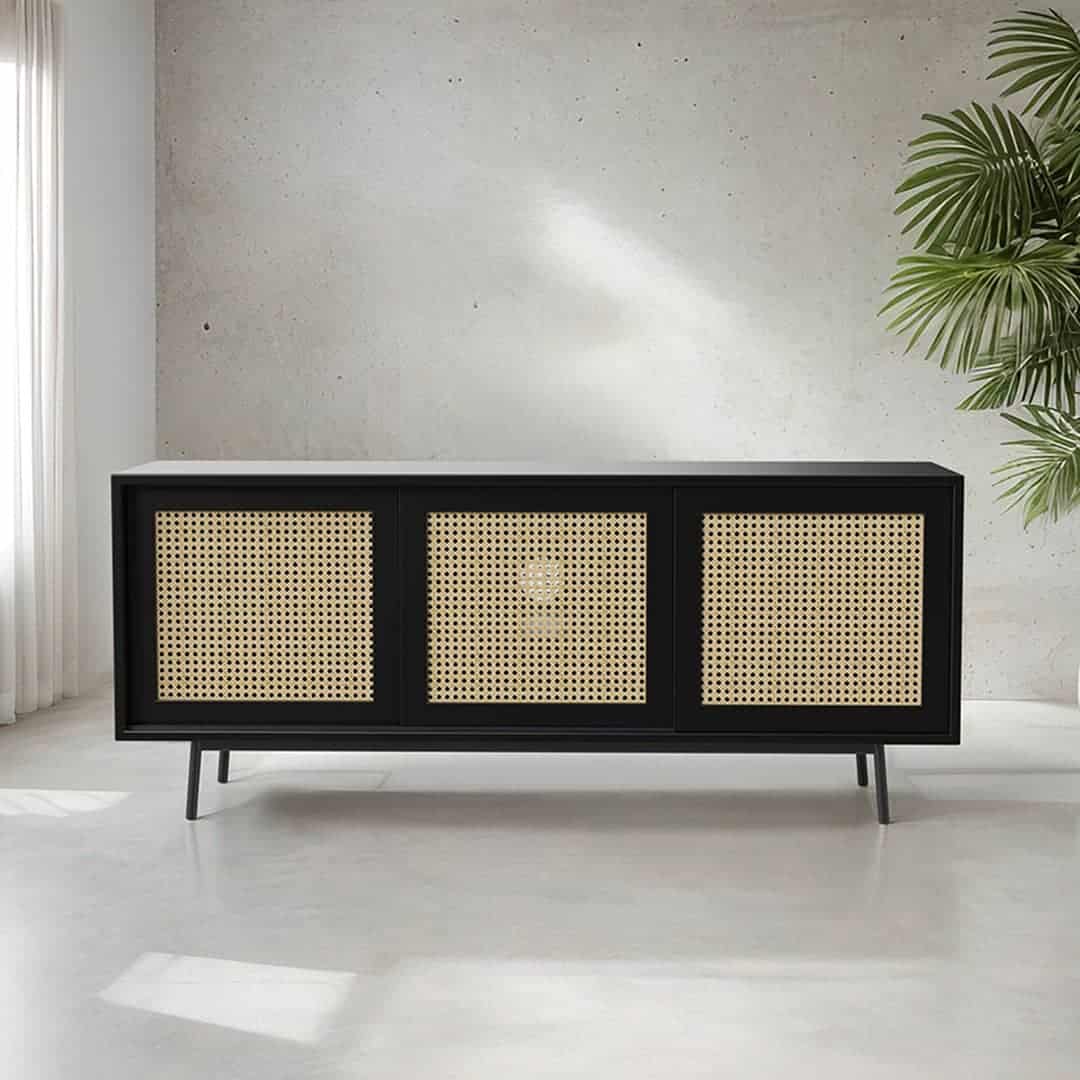 Ba cánh tủ được làm từ mây đan thủ công giúp tăng tính thẩm mỹ và tạo điểm nhấn tự nhiên, đồng thời giúp lưu thông không khí bên trong kệ – lý tưởng để đặt các thiết bị điện tử như đầu phát, modem hoặc loa.