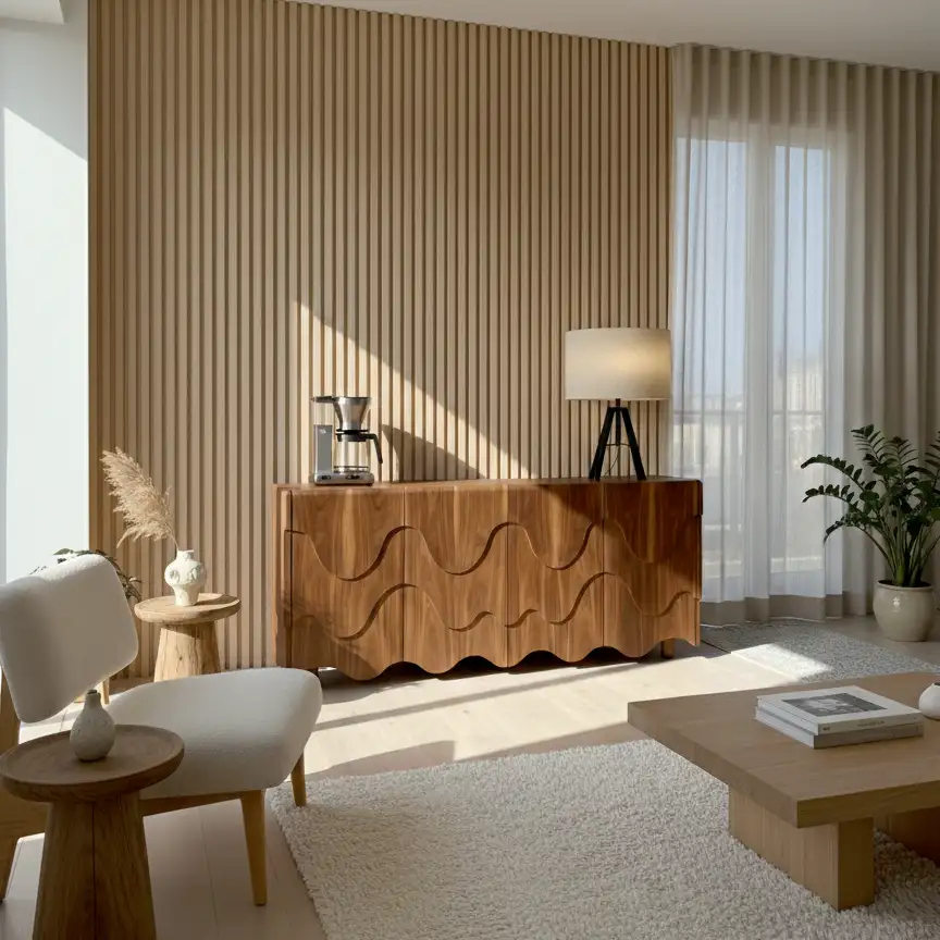 Chiếc tủ không chỉ là nơi lưu trữ mà là một tác phẩm điêu khắc với những đường sóng lượn mềm mại (Wavy Design), mang đến vẻ đẹp Zentinh tế cho phòng khách hoặc phòng ăn của bạn.