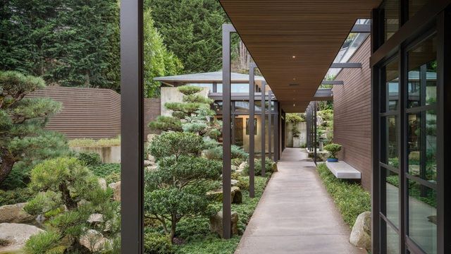 Hành lang lớn chạy dọc ngôi nhà và song song là khu vườn mini với hàng trăm cây bonsai đẹp mắt. Phía bên ngoài của căn biệt thự là một công việc cây xanh bên sông trong khu phố Washington Park.