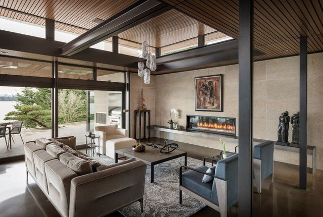 View từ phòng khách hướng ra hồ với một tầm nhìn rộng, làm cho ngôi nhà trông giống như một căn biệt thự sang trọng nằm ven một bãi biển nào đó.