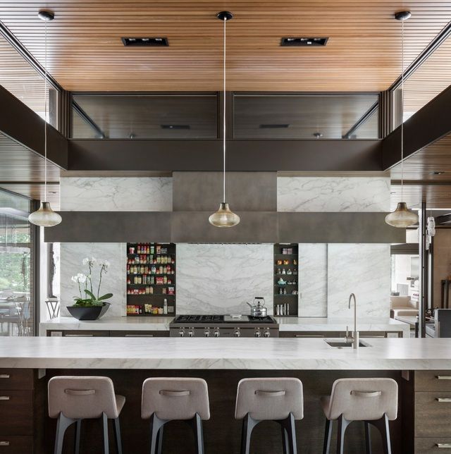 Khu bếp với vật liệu đá tự nhiên kết hợp cùng gỗ tạo nên một khu bếp sang trọng và hiện đại, với đầy đủ tiện nghi sinh hoạt cho một gia đình.