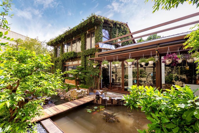 Trung tâm của ngôi nhà là sân vườn được làm tiểu cảnh với hồ cá mini và những cây bonsai đẹp mắt, vật liệu sử dụng là đá tự nhiên được sắp xếp một cách ấn tượng.