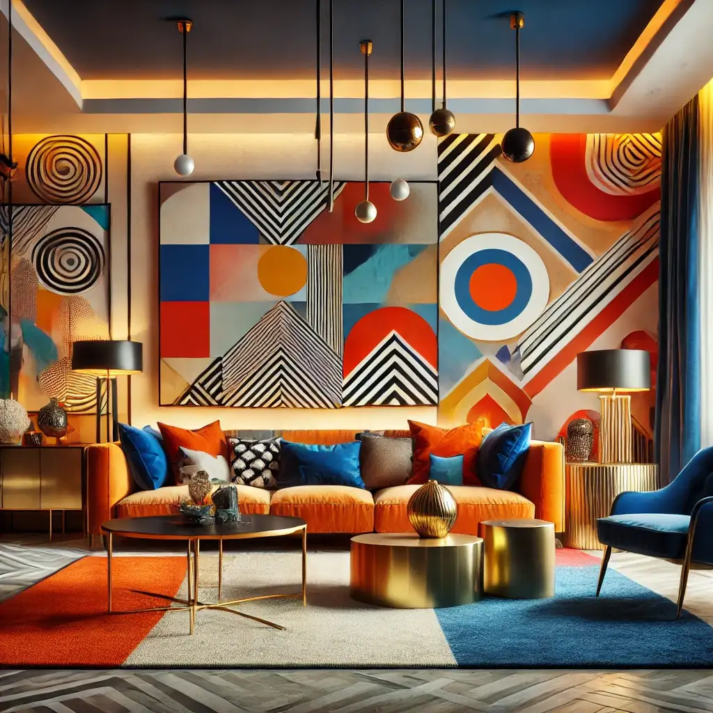 - Họa tiết nghệ thuật trừu tượng xuất hiện trên tường, đồ nội thất, thảm và rèm cửa.