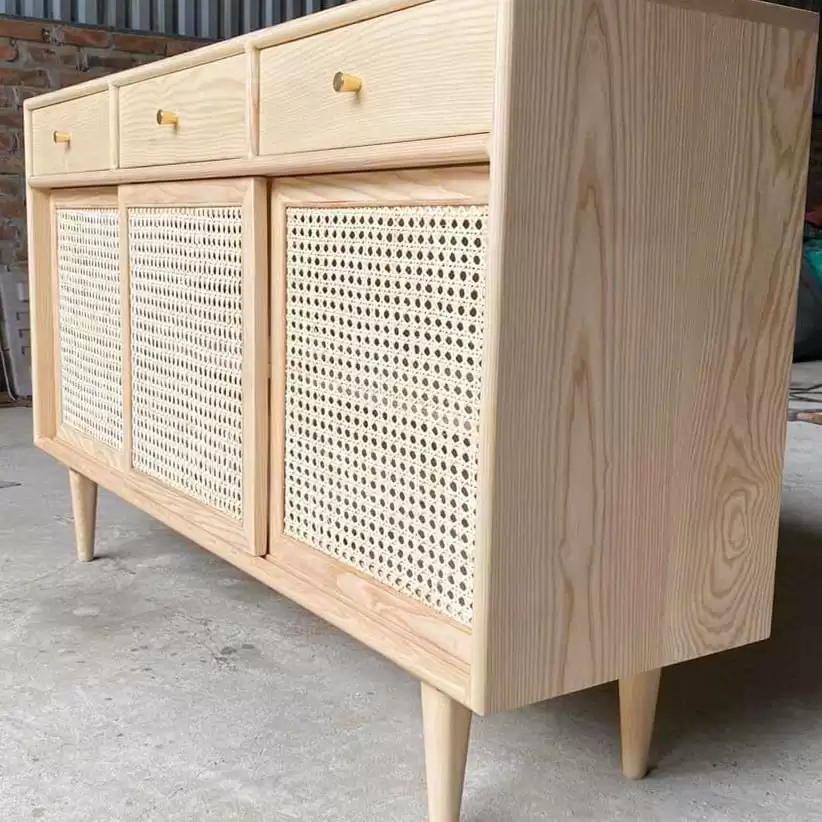 Sản phẩm được làm từ plywood phủ veneer tần bì (ash) kết hợp với gỗ tần bì tự nhiên và cánh tủ mây đan thủ công, mang lại độ bền cao và thẩm mỹ tinh tế.