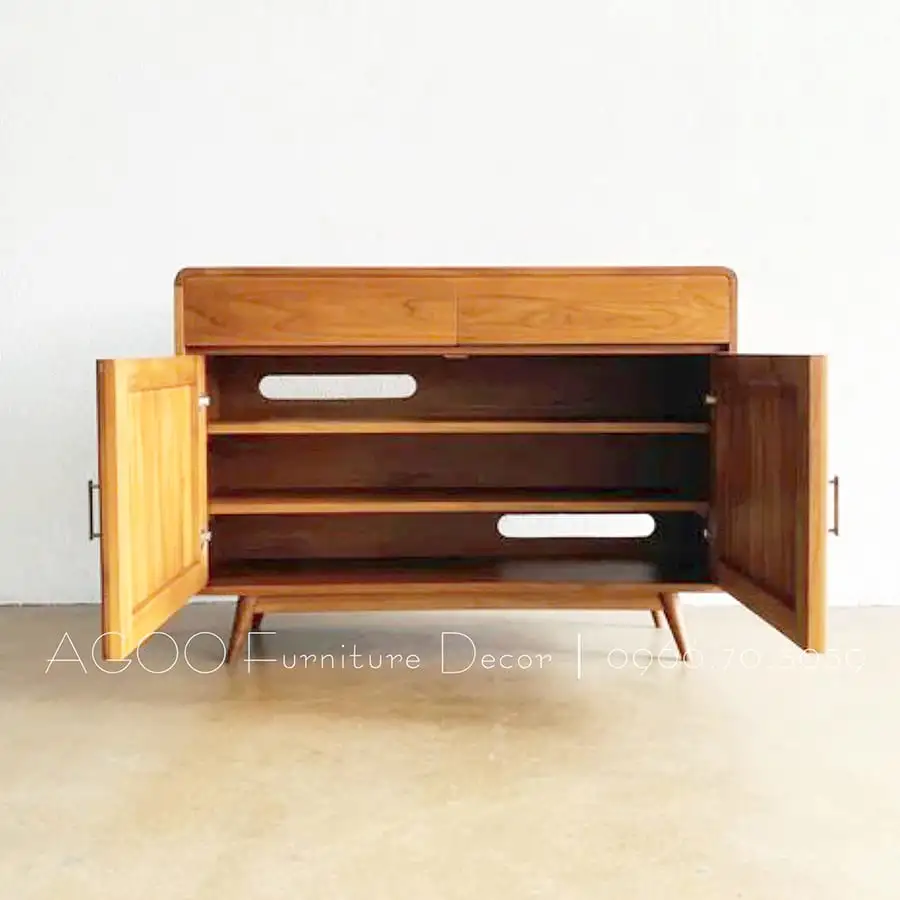 Bên trong tủ gồm 2 ngăn kéo phía trên và 2 cánh mở rộng phía dưới, với kệ chia tầng khoa học giúp sắp xếp gọn gàng các vật dụng: chén dĩa, ly tách, sách báo hoặc đồ decor nhỏ.